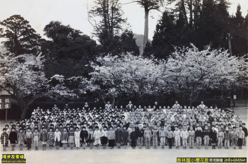 此刻,分享一張香林國小最具古早味的師生大合照,在現今的校區,也是當年的校區,有興趣的朋友可以算算看當年的師生數有多少!碩大壯觀的櫻花海,搭配井然有序的拍照姿勢,依稀可見左側的博物館,還有後方的香林神木樹梢。