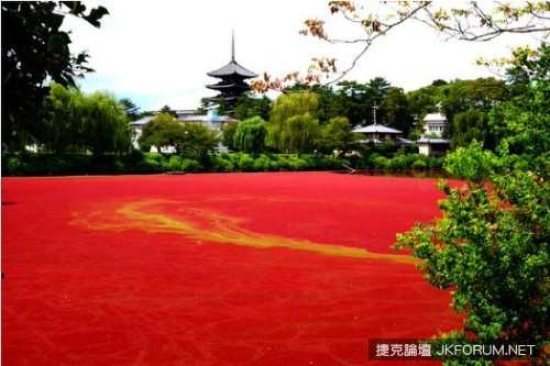 來到關西旅遊必去的古都奈良,氣派的東大寺與被視為神的使者的小鹿們,都是不能錯過的景色。不過近日,奈良公園竟然出現了血池的奇異景色,許多遊客都對於這樣的景色嘖嘖稱奇,紛紛拿起相機捕捉血紅色的池水奇景。