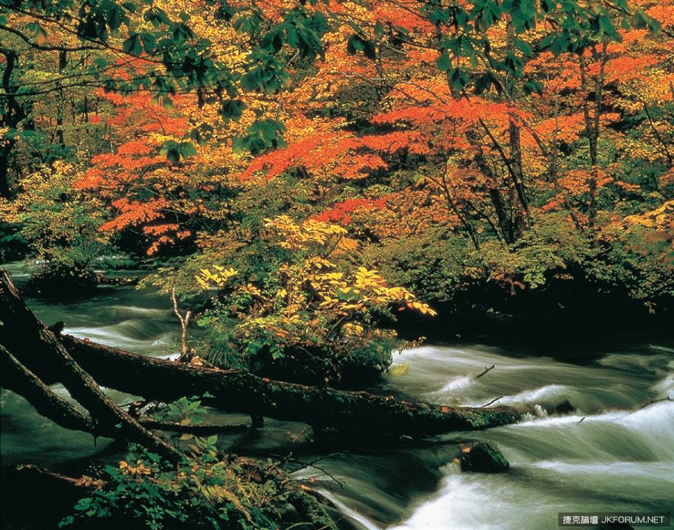 沿岸遍布扁柏、山毛櫸、楓樹等的原始森林