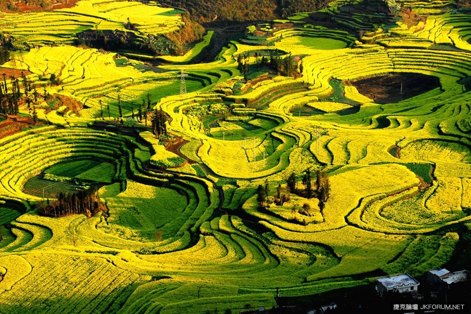 羅平螺絲田位於雲南曲靖羅平縣城西北十公里處的牛街,由於這裡的梯田是圈狀的,遠遠看去像是螺絲上的旋紋,因此而命名。