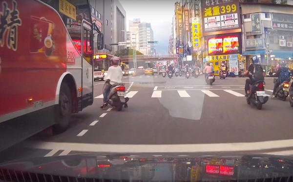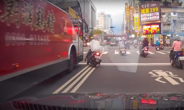 趕時間還是懶的待轉?台中一名網友23日將一段行車記錄器畫面PO上Youtube,畫面顯示,網友行經三民路與太平路口時,一旁突然竄出一位女機車騎士想要「直接左轉」,但當時恰逢綠燈亮起,左側一輛公車緩緩駛出,差點與女騎士「0距離接觸」,場面相當驚險。