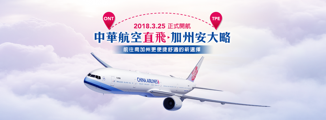 中華航空近來積極布局國際航線,飛往美國航點,除了有舊金山、洛杉磯、紐約以及夏威夷、關島等航點外,今年預計在3月25日新增從台北(桃園)飛往美國加州安大略直飛航班,是繼1971年開航洛杉磯後,為第二條由台灣直飛美國加州大洛杉磯地區的航線,更是亞洲第一家往返安大略設有定期航班的航空公司。目前從台北直飛美國加州安大略航班的班次已開放預訂,每天直飛1班,同時祭出早鳥優惠,含稅價23,150元起。此外,華航提供商務艙、豪華經濟艙等旅客免費兌換機上Wi-Fi、購票享租車優惠,獨享飛行旅程的專屬服務。