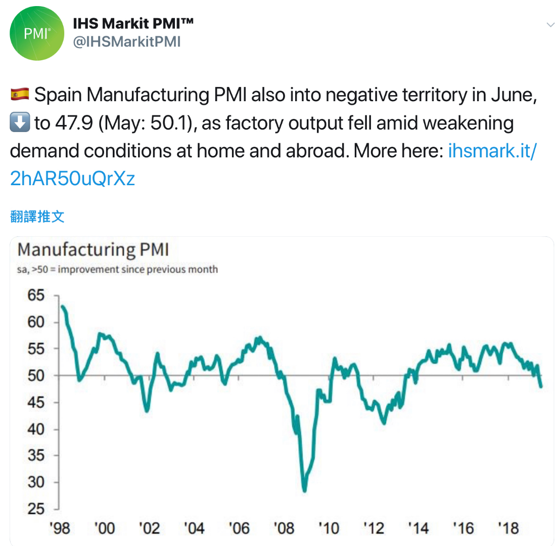 西班牙6月製造業PMI自5月的50.1大跌至47.9(見圖)、近6年來第2度低於榮枯分界點(50.0),創2013年4月以來最低。