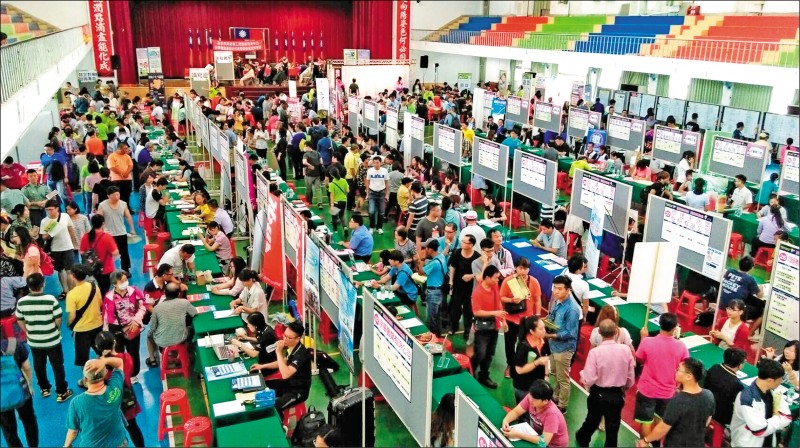 由於畢業生投入尋職,行政院主計總處昨公布8月失業率3.89%,圖為高市徵才活動示意圖。(資料照)