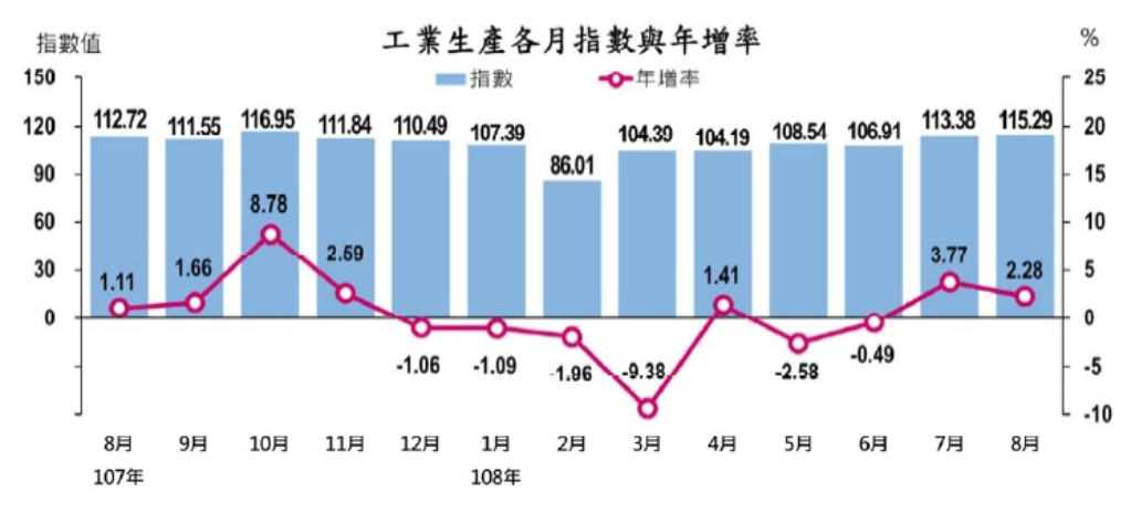 經濟部表示,8月工業生產指數115.29,較上月增加1.68%,較上年同月增加2.28%,其中,製造業年增2.11%,礦業及土石採取業年增0.34%,電力及燃氣供應業年增5.00%,用水供應業年減0.26%。