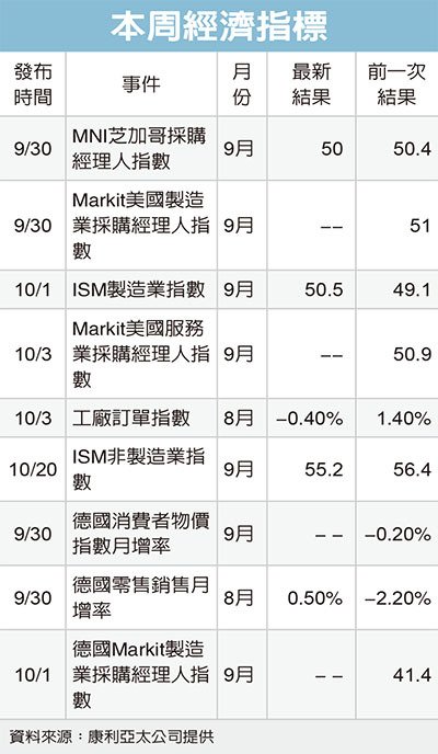 10月初,瑞典、荷蘭、西班牙、義大利、法國、德國、英國等各國將公布9月製造業與服務業採購經理人指數,德國也是關注的焦點,因為德國的採購經理人指數已萎縮一段時間,8月更下降至41.1。