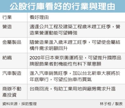 傳統產業一向是多數公股行庫企業金融部門的大客戶,涵蓋製造業、運輸業、不動產等,對於第4季展望,多家公股行庫的看法一致,部分產業將進入傳統旺季,好光景將可延續至明年年初,這部分看好的行業包括:營造、金屬製品、汽車製造。