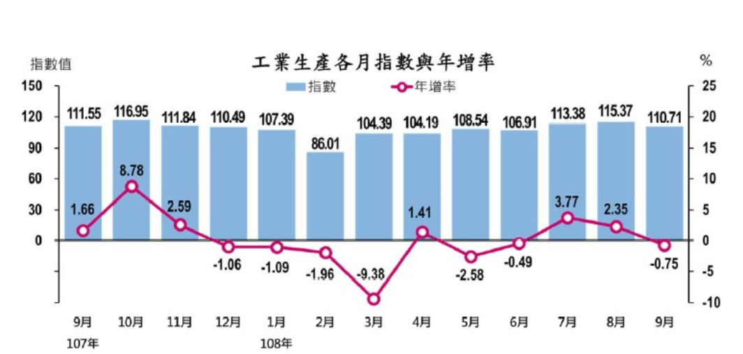 經濟部23日公布今(2019)年9月工業生產指數,數值為110.71,與上年同月相較減少0.75%,年變動率終止連兩個月的正成長而翻黑;其中,9月製造業生產較上年同月減少0.65%,受到全球景氣放緩、貿易需求降溫等因素影響,年變動率亦呈負成長;另外,第三季製造業生產指數為113.10,創下歷年單季次高,扭轉今年前兩季負成長態勢。