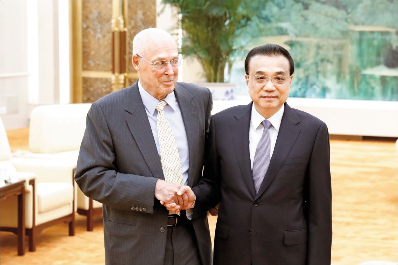 中國國務院總理李克強二十三日在北京會晤前美國財政部長鮑爾森。(路透)
