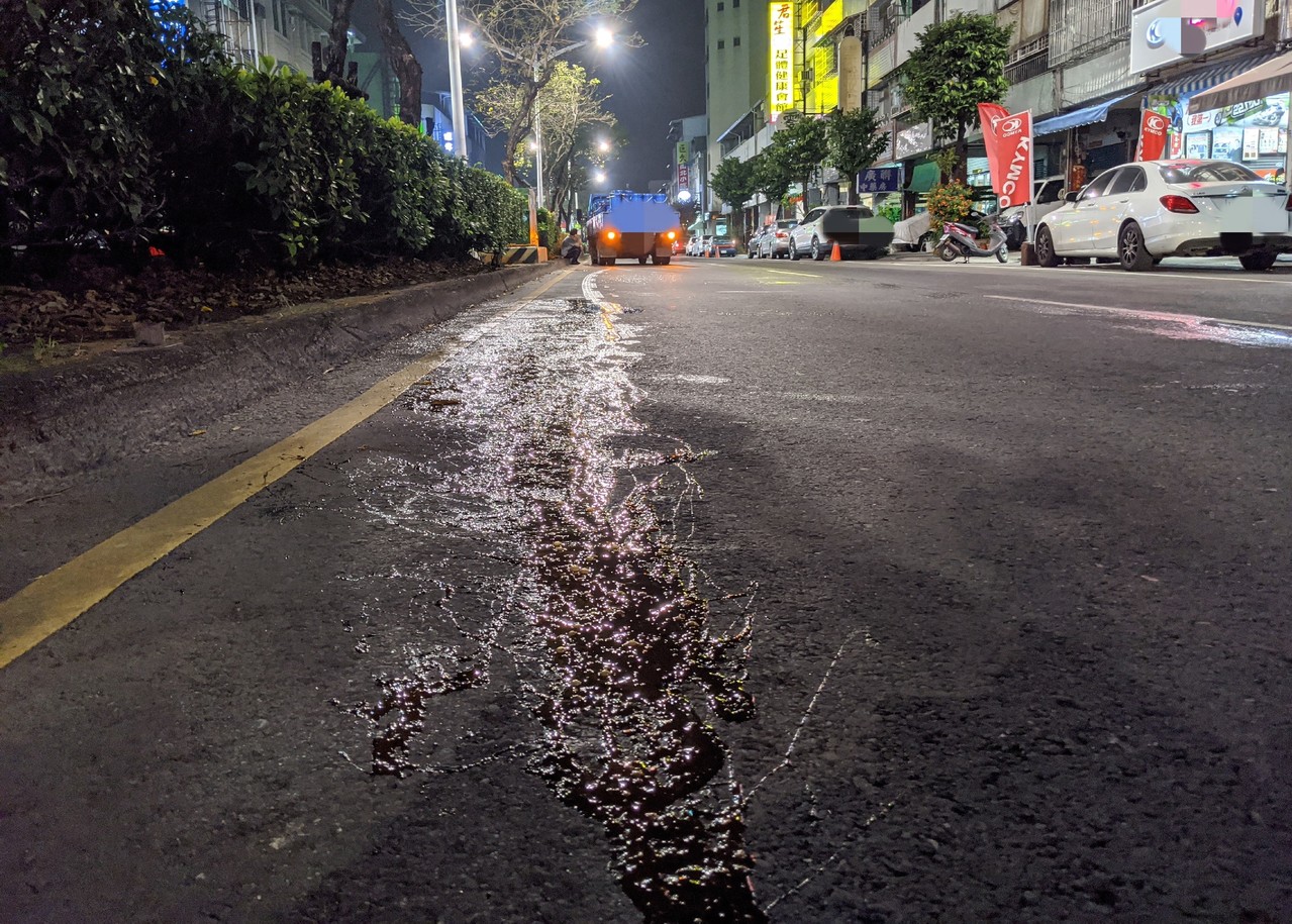 貨車打翻的液體在路面留下一道長又黏稠的水漬。陳姓駕駛行駛在貨車後方,直接輾過貨車打翻在路面的液體,噴濺到汽車上,又二度目擊貨車上的液體翻覆,見貨車駕駛下車查看,憤而走到在一旁等待警方到場。