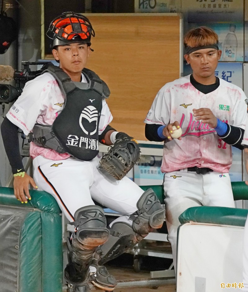 統一獅捕手林祐樂(右)、陳重羽(左)。(記者黃志源攝)