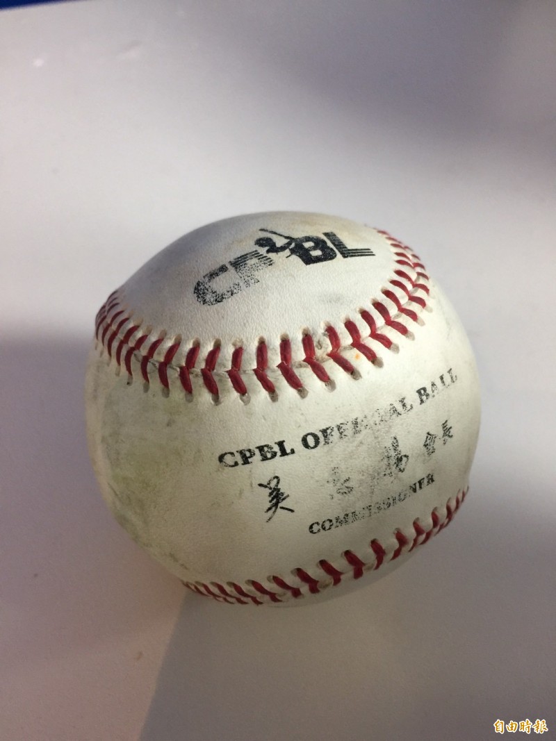 兄弟象隊史第三萬安的比賽用球。(記者羅志朋攝)