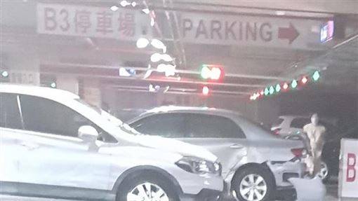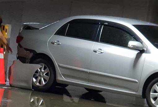 從照片中可以看到,銀色轎車的左側完全被撞凹,後車殼的保險桿更是整個掉落,可見當時撞擊力道之大,仔細一看還可以發現,當時停車場的地板是濕的,外頭的雨勢應該不小,不排除是雨天造成的意外,不過許多網友還是好奇討論意外究竟怎麼發生。