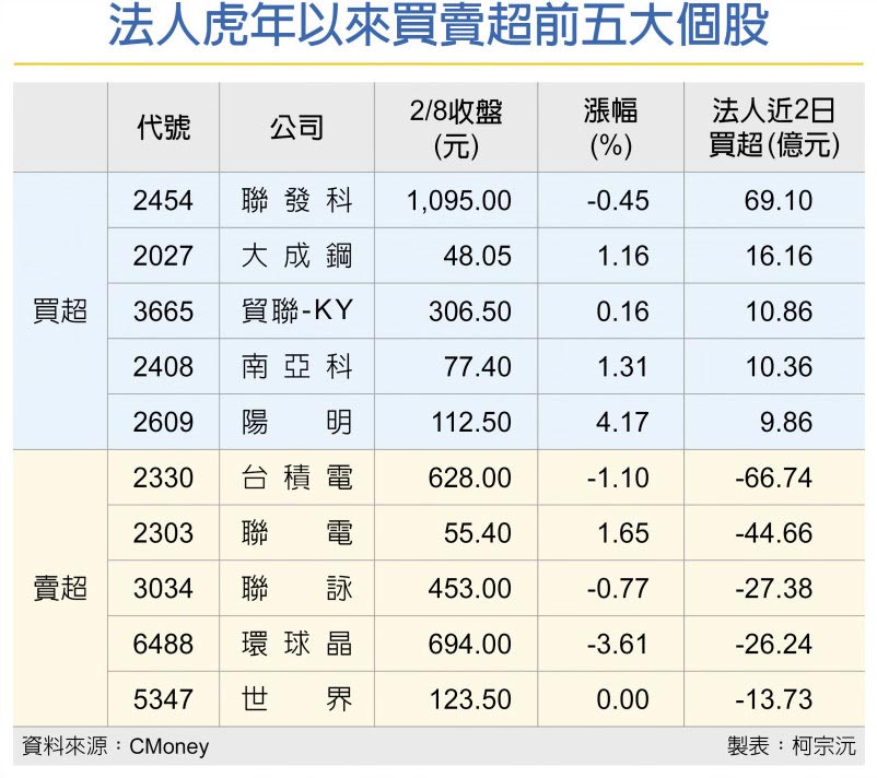 籌碼面上外資與自營商8日分別續賣25.38億元、11.95億元,投信買超42.61億元,外資並於期貨市場回補745口空單。個股方面,晶圓雙雄台積電與聯電再遭法人提款65.19億元,台積電虎年以來市值已蒸發2,074億元,環球晶也持續消化世創收購案破局的利空,法人單日續賣17.21億元。