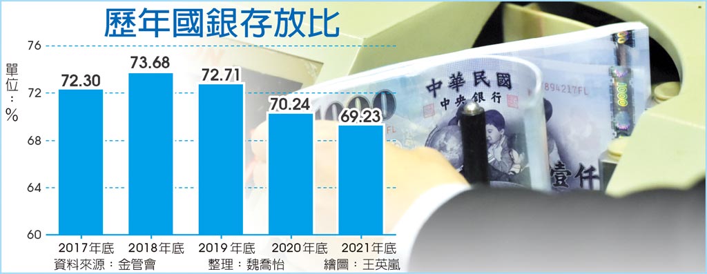 國銀存放比從2018年底的73.68%一路下探,至2021年12月底國銀存放比續降到69.23%,再創歷史新低,即代表銀行存款有30%無法貸放出去。