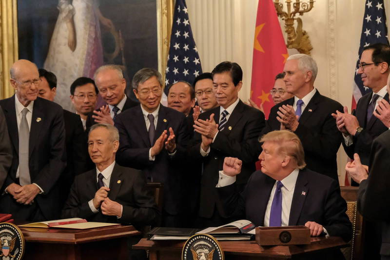 美總統川普與中國副總理劉鶴在2020年簽署第一階段貿易協議。(歐新社)