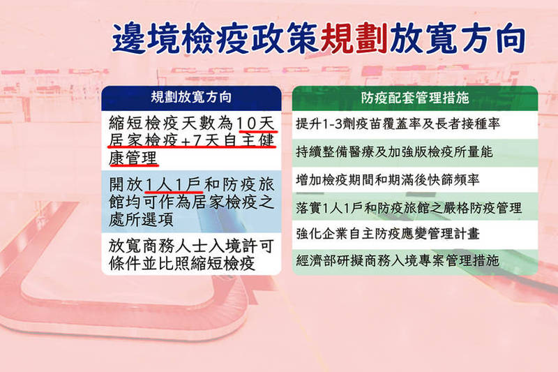 指揮中心今宣布未來入境居家檢疫政策方向,為「縮短居家檢疫天數為10天,並於檢疫期滿後進行7天自主健康管理」。(本報後製)