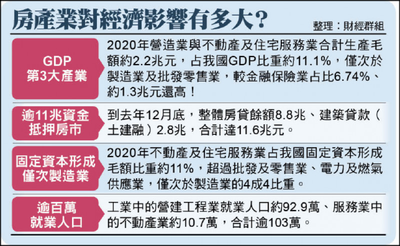 另營造業與不動產及住宅服務業合計占我國GDP比重約十一.一%,僅次於製造業及批發零售業;到去年底,整體房貸餘額及建築貸款(土建融)合計達十一.六兆元,是屢創新高;而營建工程業與不動產業更是共養活逾一○三萬就業人口。