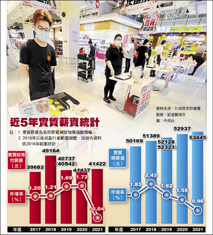 近幾年台灣經濟表現亮眼,去年GDP(國內生產毛額)成長六.二八%,創下十一年新高,人均GDP更由二.八萬增至三.三萬美元。然而,近年來物價漲勢兇猛,民眾尚未享受經濟成長果實,已先深刻感受到物價上漲壓力,薪資成長追不上物價上漲速度,時隔五年,實質經常性薪資再度倒退,儘管實質總薪資仍成長,但物價漲勢若無法抑制,薪資增幅遲早被通膨吃光光。