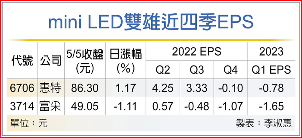 由於Mini LED在IT滲透率不如預期,汽車應用尚未放量之下,Mini LED指標廠第一季財報全盤皆墨,設備商惠特(6706)、富采(3714)連袂繳赤字財報,虧損均較前一季擴大,且雙率均明顯下滑,富采一季的虧損就吃掉去年度獲利,展望第二季景氣,均看保守。
