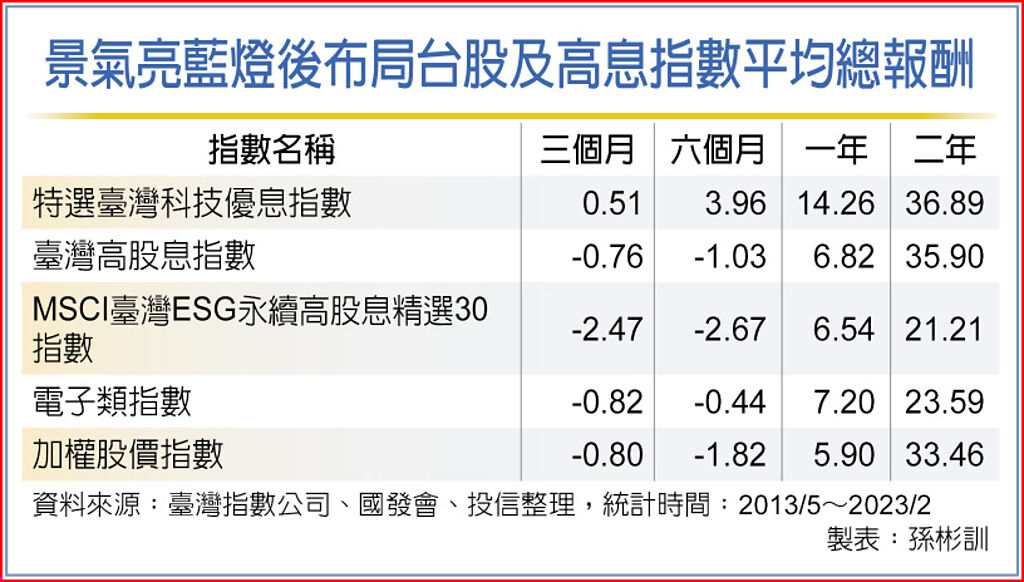 國內景氣燈號連續五個月出現代表景氣「低迷」的藍燈,反映台灣經濟處於調整階段。投信法人認為,藍燈代表景氣進入長期低檔區,股市多為相對低點時期,且就過去數據顯示,在藍燈時進場布局台股,後市報酬率可期,部分高息指數表現更勝大盤。