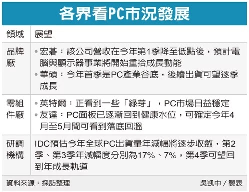 事實上,PC零組件端3月下旬已陸續釋出產業反轉向上的跡象。全球電腦處理器龍頭英特爾日前在財報會議指出,正看到一些「綠芽」,PC市場日益穩定,庫存修正進度一如該公司預期,暗示PC市場可能即將觸底。英特爾預期今年全球PC出貨量將達2.7億台,未來增加到每年約3億台。