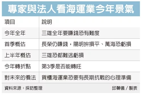 就首季財報來看,專家認為,長榮應該還能賺錢,但獲利必然大縮水,減幅甚至恐比馬士基大。長榮是貨櫃海運業的資優生都難逃衝擊,陽明、萬海首季獲利更相對難料。