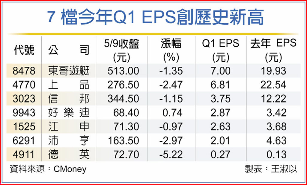 台股上市櫃公司第一季季報公布期限到15日(下周一),目前493家公司公告財報,統計第一季每股稅後純益(EPS)創下歷史新高公司有東哥遊艇(8478)、上品(4770)及信邦(3023)等七檔,在景氣逆勢中表現亮眼。