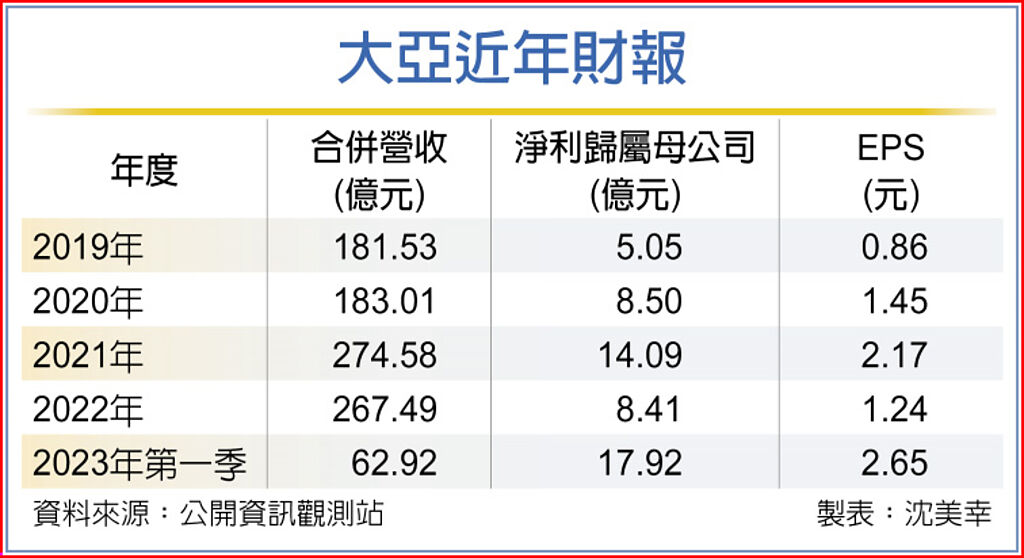 大亞9日董事會承認第一季財報,單季合併營收62.92億元、營業利益2.74億元、淨利歸屬母公司業主17.92億元,EPS為2.65元,遠優於同業華新(1605)的0.56元、宏泰(1612)的0.5元。
