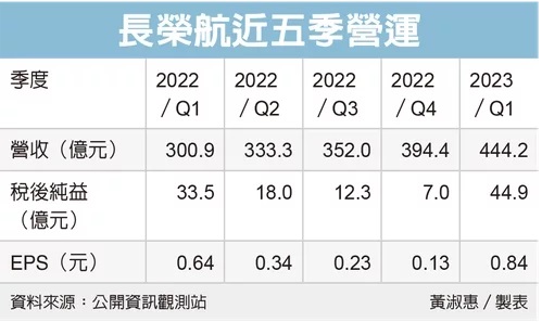財報方面,長榮航空首季稅後純益為44.98億元,每股純益0.84元,較2022年同期每股純益0.64元,增加0.2元,單季獲利年增率達31%。