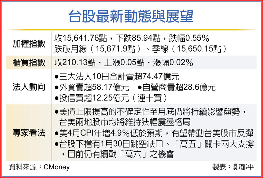 美國4月CPI公布前市場觀望氛圍濃厚,加上美國總統拜登與眾議院議長麥卡錫會面爭取國會通過提高債務上限未取得共識,加權指數10日收15,641.76點,失守月線及季線,成交值也萎縮至2千億元以下。反觀櫃買指數則相對活躍,尾盤翻紅小漲,並守穩於季線之上,法人認為,短線中小型題材股仍將擔綱主流。