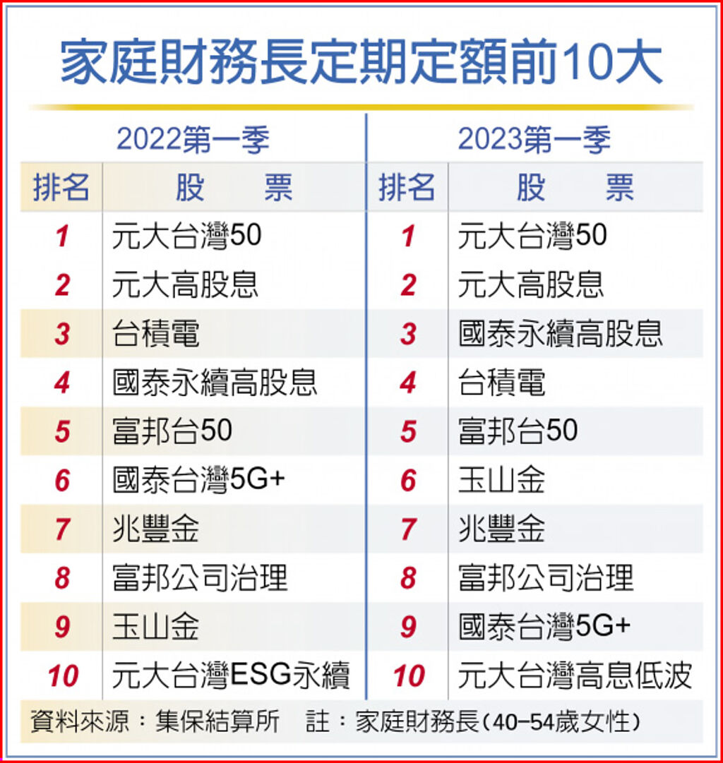 另外,在定期定額標的排名部分,台股ETF更是受到媽媽股民青睞;據統計,2022年第一季前十名排行中,台股ETF即占七檔,前三名分別是元大台灣50、元大高股息及台積電。到了2023年,台股定期定額標的第三名,則變成國泰永續高股息,擠下台積電。