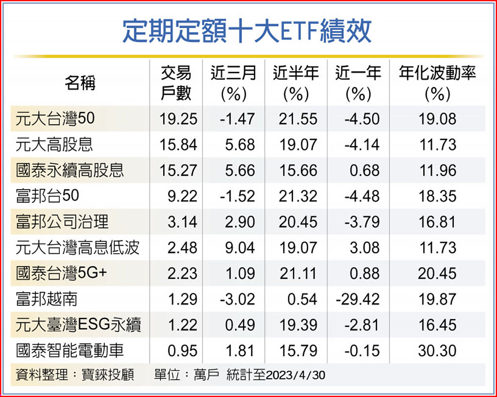 依寶錸證券投顧統計,截至4月底,近三月績效前三強為元大台灣高息低波、元大高股息及國泰永續高股息;近半年前三強為元大台灣50、富邦台50及國泰台灣5G+;近一年前三強則是元大台灣高息低波、國泰台灣5G+及國泰永續高股息;若觀察時間拉長至近三年除元大高股息外,其他有近三年投資績效者,報酬率都在55%至69%。