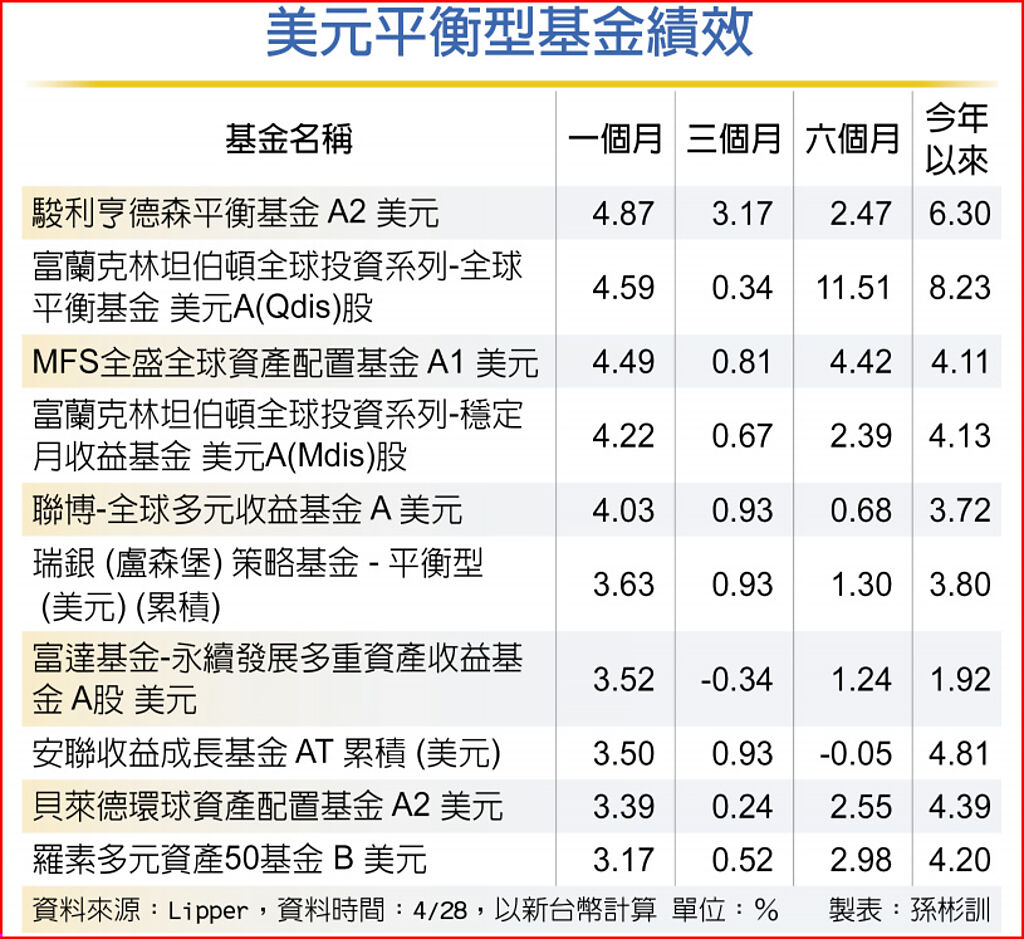 近期股市投資人觀望美國聯準會(Fed)升息政策,加上企業財報多空參半,美國區域銀行風暴似有再起趨勢,投資氣氛趨向審慎,股市震盪回檔。投信法人建議,投資組合應增加平衡基金的比重,藉由專業投資團隊即時應對市場變化進行調整,截至4月底,近一個月美元平衡型基金平均漲幅在3%以上,表現相當穩健,可做為攻守皆宜的好選擇。
