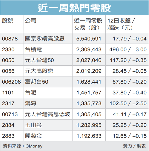 本周前十熱門零股標的依序是國泰永續高股息、台積電、元大台灣50、元大高股息、富邦台50、台泥、鴻海、元大台灣高息低波、玉山金、開發金,成交554萬至119萬股不等,涵蓋半導體、金融、電子零組件、原物料等產業及台股相關ETF。