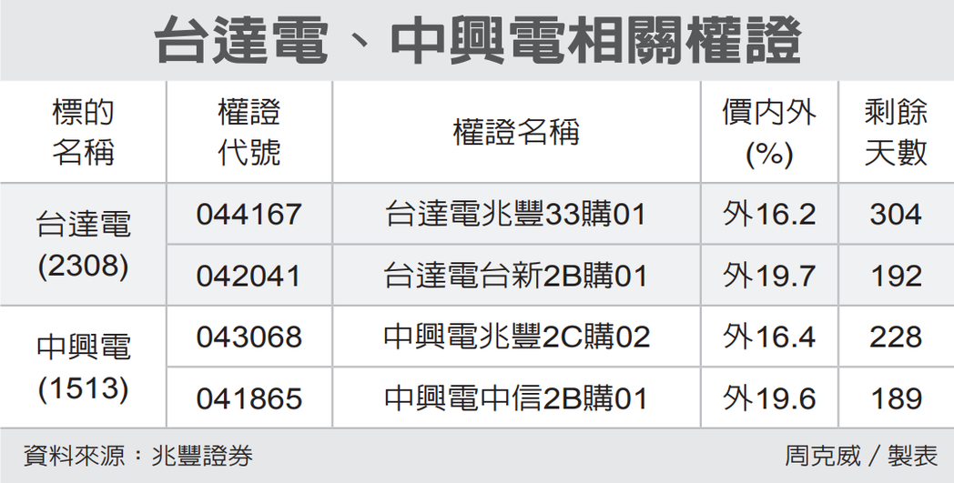 上市櫃公司第1季財報即將全數公布完畢,其中,基本面突出、未來業績展望佳的個股,已吸引投資買盤的青睞,其中,非燃油車相關供應鏈業務看好的台達電(2308)、中興電(1513)等個股成為焦點,權證券商建議,可以利用偏價外的認購權證參與個股的業績行情。