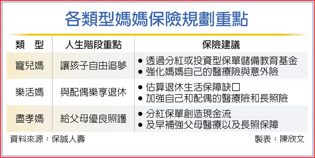 母親節到來,壽險業者建議媽媽們在寵愛家人的同時,也要重視自己的保障。藉由每年定期檢視自己與家庭的保單,再依照家庭的財務狀況以及需求,強化全方位的安心守護,由於媽媽隨著自己年紀與家庭成員的變化,在每個人生階段有不同的目標,建議可依照本身需求與家庭成員的成長來規劃適切的保險保障。