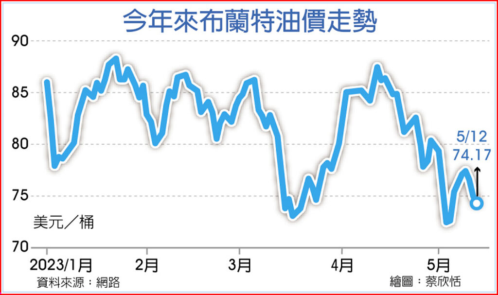 國際油價剛開始還隨產油國聯盟減產上漲,但近幾周因美國銀行接連爆雷倒閉而轉跌,投資人憂心銀行風暴會加深經濟衰退危機,連累原油需求,這讓國際石油指標布蘭特原油5月初觸及2021年12月來新低。
