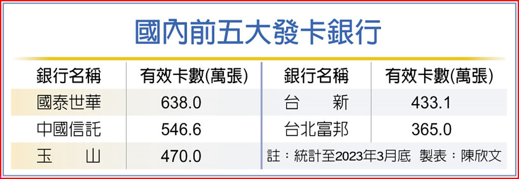 統計至去年底,信用卡有效張數排名依序為國泰世華、中信、玉山、台新與台北富邦銀行,這五家銀行均擁有發卡量突破百萬的神卡。中信LINE Pay卡是全台發行量最大的一張卡,信用卡占237萬張、簽帳金融卡286萬張;玉山家樂福聯名卡、台新新光三越聯名卡、中信中油聯名卡等也都突破百萬張。