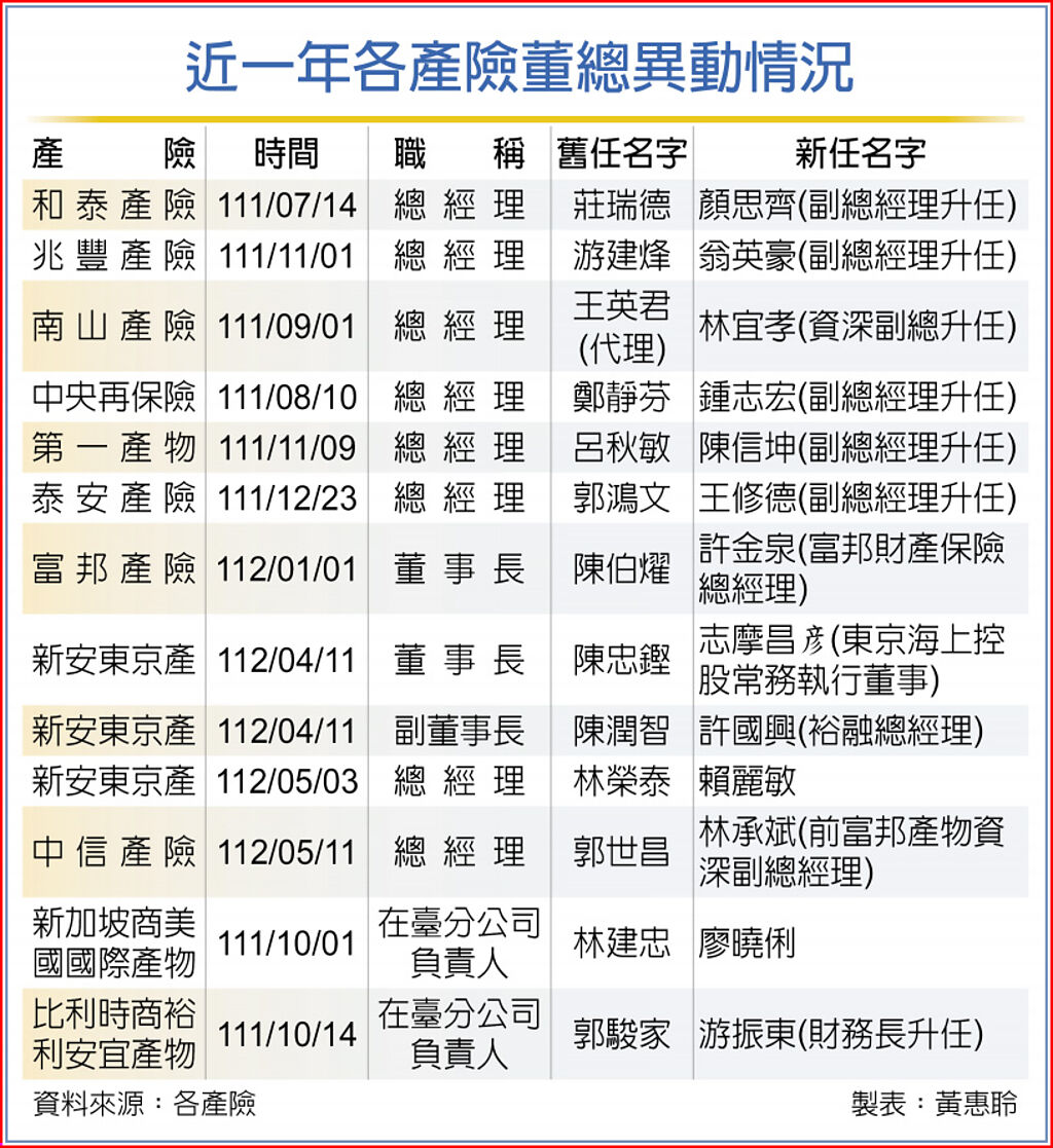 產險業近一年猶如遭逢巨災,一張防疫保單理賠金額已逾2,600億元外,截至5月12日為止,已有13位董事長或總經理換人,雖然易動原因非全然因為防疫保單,但一年內有三分之二董總換人,也創下產險業另一項新紀錄。