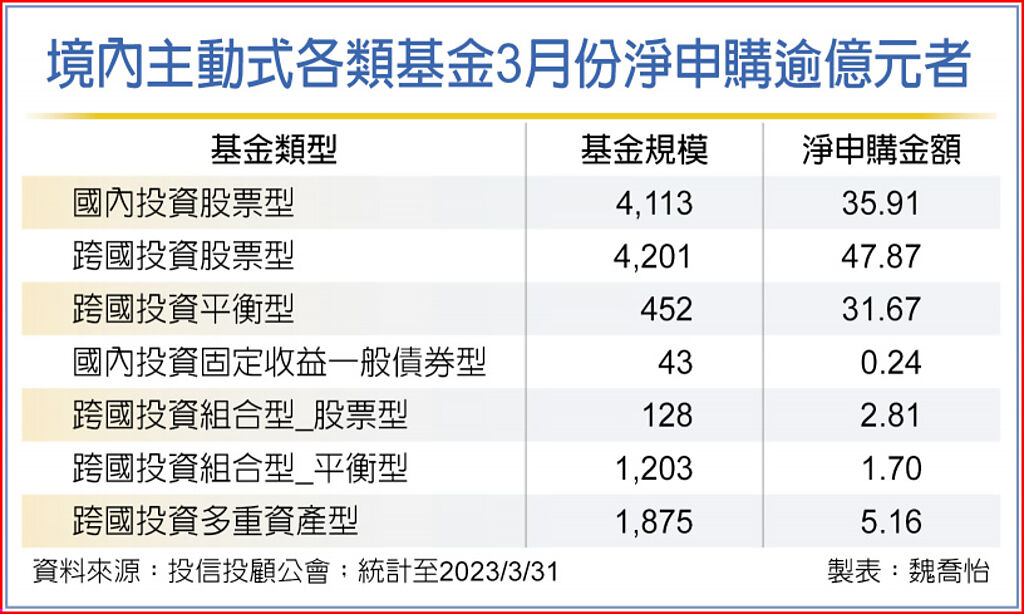 受惠市場逐步回穩,資金回流股票型與平衡型資產。根據投信投顧公會統計,3月境內各類主動式基金的淨申購金額,以跨國投資股票型基金居冠、達47.87億元,台股基金與跨國投資平衡型分別以淨申購35.91億元、31.67億元,各居二、三位。