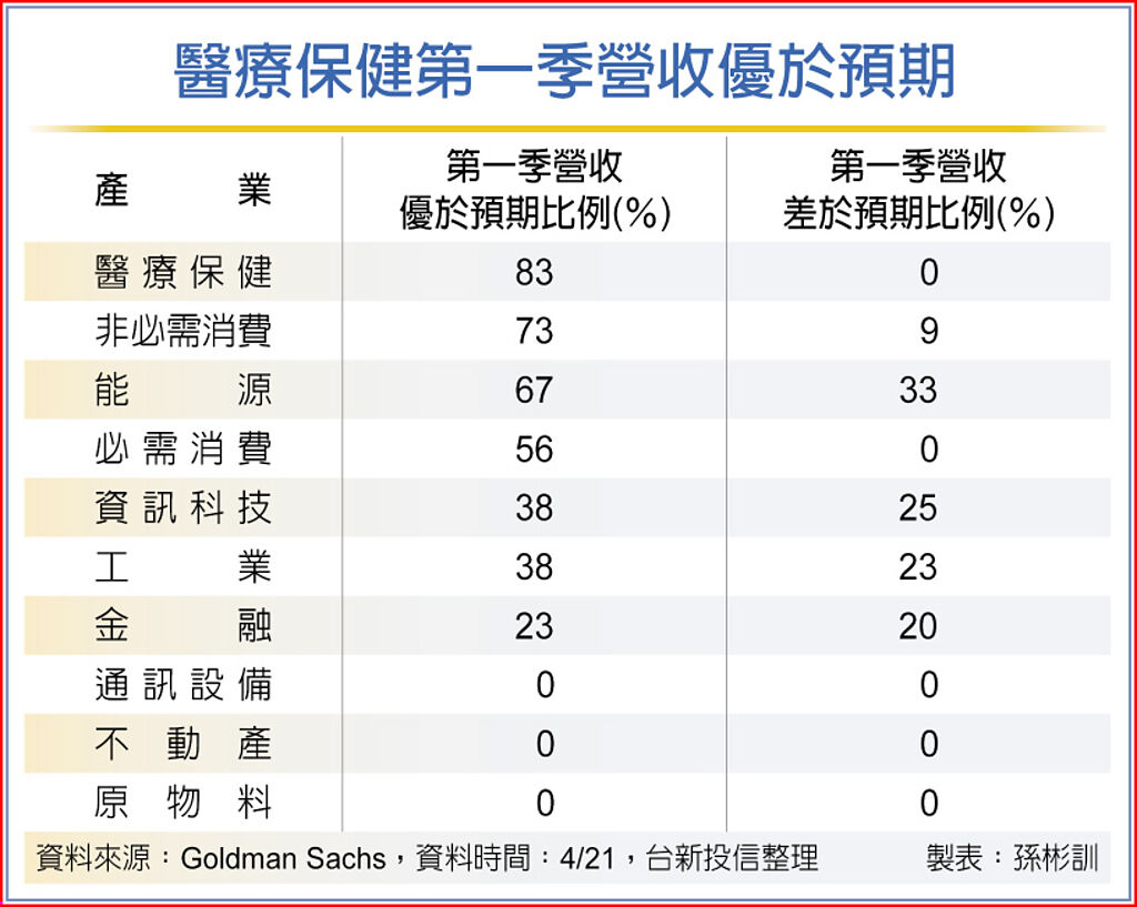 台新醫療保健新趨勢基金經理人黃俊晏表示,第一季目前已公布財報的公司中,醫療股表現再次優於大盤S&P500指數,盈餘67%優於預期,較大盤優於預期的53%佳,更難能可貴的是,沒有差於預期的公司;營收表現方面,更有高達83%優於預期,是所有產業表現最佳,較大盤僅40%優於預期勝出許多,同時亦沒有差於預期的公司。