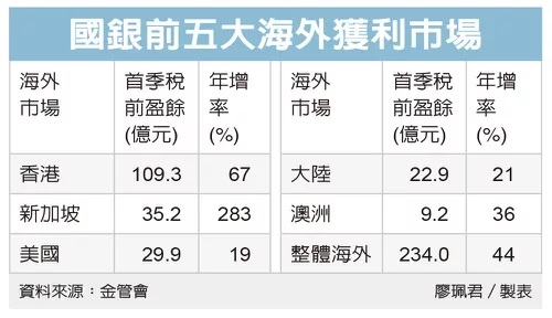 新加坡市場則緊追其後。據統計,首季國銀新加坡市場稅前盈餘35.2億元,也締造史上同期新高、年增2.8倍,比香港獲利年增67%更大,首度踢走美國,居國銀海外市場獲利第二大。