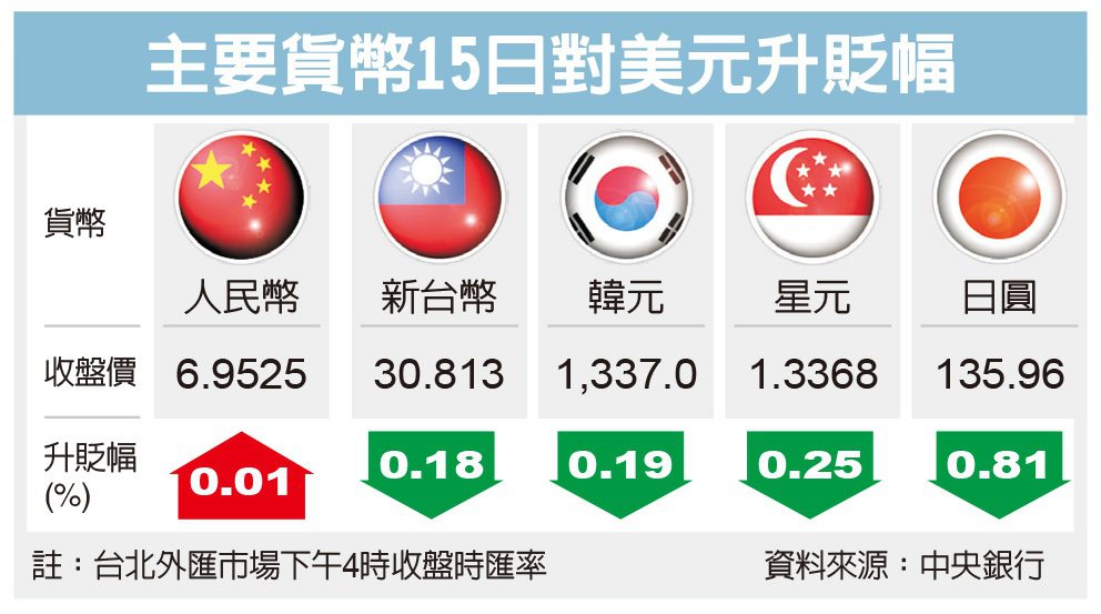 根據央行數據,美元指數昨日升值0.4%,亞幣之中,日圓重貶0.81%、星元貶值0.25%、韓元貶值0.19%,新台幣貶值0.18%,唯一升值的是人民幣,升值0.01%。