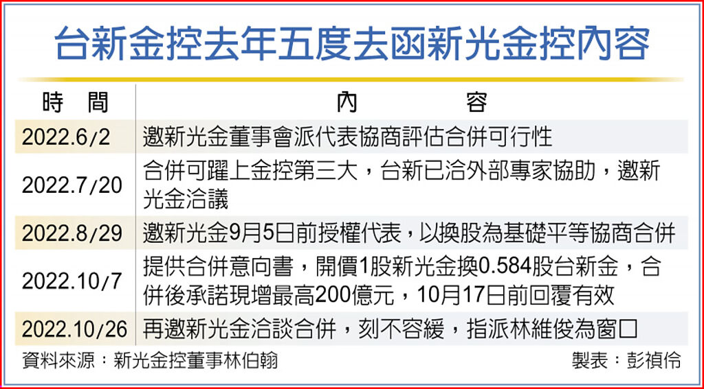 由台新金董事長吳東亮署名的「密函」,去年6月2日、7月20日、8月29日持續去函新光金,邀請以「換股為基礎」平等協商兩家金控合併事宜,同年10月7日台新金再度去函,提出「合併意向書」,以10月6日前30個交易日平均收盤價為基礎,開出1股新光金換發台新金普通股新股0.584股,以文字來看,合併存續方應是台新金控,且合併後,台新金承諾要現金增資最高200億元,協助強化新光人壽資本。