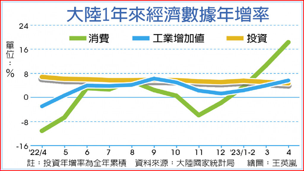 外媒引述經濟學家分析,去年4月上海處於封鎖狀態,導致企業和消費者活動大幅降溫。「今年4月工業生產與零售銷售成長,但這是與去年同期相比,與去年3月相比則陷入停滯。因此在低基數下,4月數據令人失望」,也顯示決策官員可能需要增強支持經濟成長的力道。