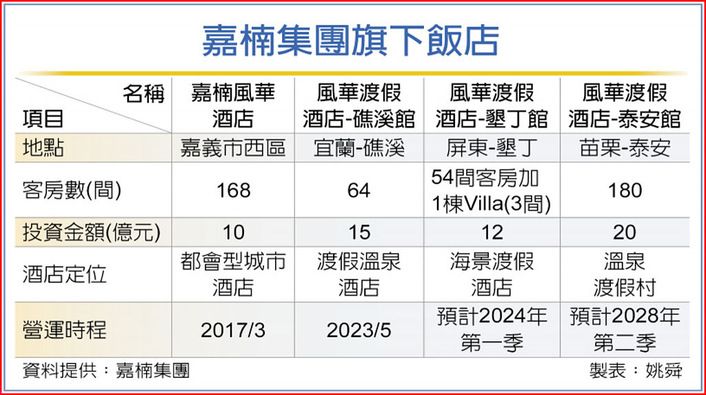 嘉楠集團從製造貢丸與加工肉品,以及食物冷鏈廠的食品業發跡,逐步將事業版圖擴展到建築營造業,再跨足觀光產業。目前集團旗下有雲林虎尾風華渡假旅館、嘉義市嘉楠風華酒店、苗栗泰安溫泉會館,風華渡假酒店礁溪館為旗下第4家飯店,第5家屏東墾丁渡假酒店預計2024年第一季開幕。