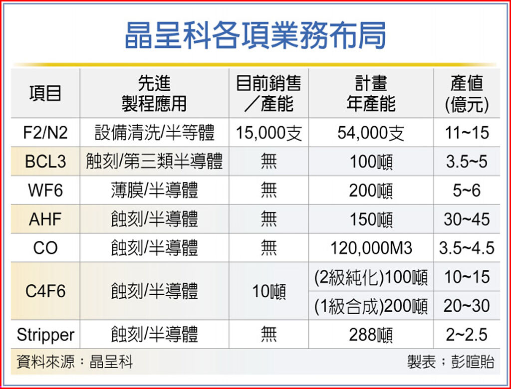 晶呈科指出,特殊氣體持續新品項研發及試產;Laser gas/氖混氣市占率已達雙位數,並持續擴大中。