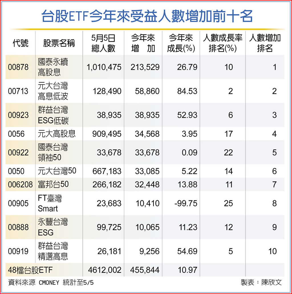最受存股族青睞的台股高息ETF,受益人與規模不斷創新高,顯示出台股高息ETF人氣暢旺。據統計,今年以來48檔台股ETF基金受益人數共計增加45萬人,其中31萬人集中在11檔高息ETF基金,隨台股進入發放股息旺季,預期高股息相關ETF買氣可望持續高漲。法人建議,依照不同理財目的及配息時間搭配做選擇,不希望賺了股息、賠了價差,存股也要考量成分股企業獲利成長性。