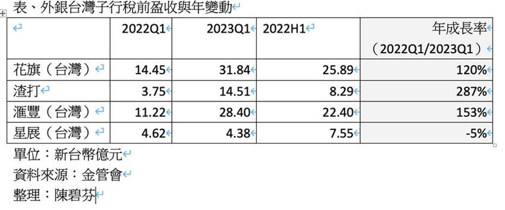 金管會本國銀行財務曝險資料顯示,今年前三月(2023年Q1)花旗(台灣)銀行累計稅前盈餘新台幣31.84億元,重捨獲利最佳外銀子行,相較去年同期(2022年Q1)成長120%,是近年來少見的強力成長,且超越2022年H1的25.89億元;金融同業主管分析,花旗出售的消金/財管業務已確定8月12日為法定交割日,在此之前,花旗台灣團隊需衝刺交割前的獲利回升,否則去年1月估價的金額將被調整。